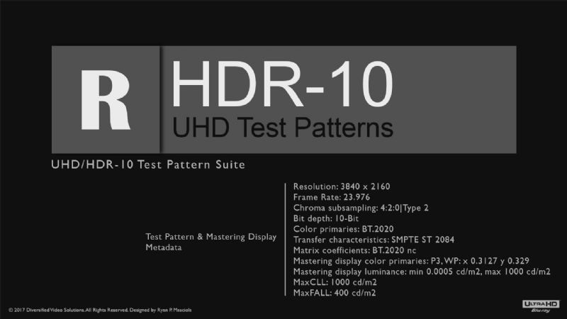 Étant donné que les modèles de test UHD/HDR actuels sont limités, j'ai créé une suite complète de modèles de test UHD/HDR-10 qui non seulement adhèrent aux nouvelles normes de l'industrie, mais sont également conformes aux normes et spécifications UHDA (UHD Alliance), résolution UHD 3840x2160, Large gamme de couleurs, BT.2020, HDR10, 10 bits, spécification de couleur ST.2086 et fonction de transfert ST.2084. Ce projet suit la même idée derrière mon "disque d'étalonnage avancé", une solution réalisable pour étalonner et/ou mesurer votre nouvel écran UHD/HDR sans avoir à dépenser des milliers d'euros pour un nouveau générateur de mire UHD/HDR. J'ai créé tous les nouveaux modèles de test à partir de zéro, des triplés qui utilisent la fonction de transfert ST.2084, une conversion RVB vers YCbCr BT.2020 précise et un encodage H.265/HEVC avec les balises de métadonnées appropriées pour que votre écran compatible HDR-10 peut déchiffrer correctement ces nouveaux modèles de test. Ce projet a également été conçu autour d'une mise en page familière, "Modèles de configuration de base", "Modèles de configuration avancée" et "Modèles divers" qui incluent des suites de fenêtres complètes à 5 % et 10 %. J'ai également inclus des workflows pour les logiciels d'étalonnage Calman, ChromaPure et HCFR. Ces modèles encodés HEVC sont disponibles à la fois dans les conteneurs .ts (MPEG Transport Stream)/.mp4 et sur un disque UltraHD Bluray entièrement créé.