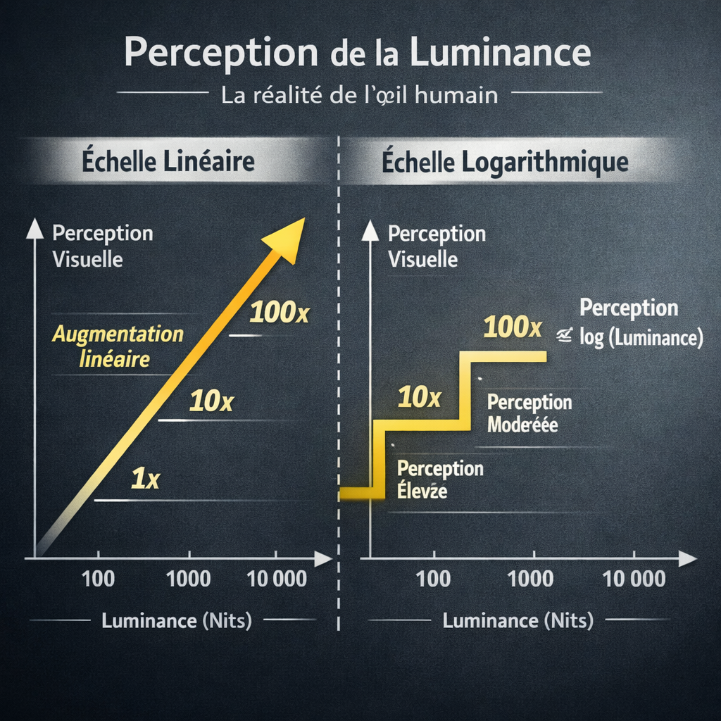 Plus de nits ne signifie pas meilleure image HDR. Analyse technique sur la perception logarithmique de la luminance, la courbe PQ (ST-2084) et les dérives marketing actuelles.