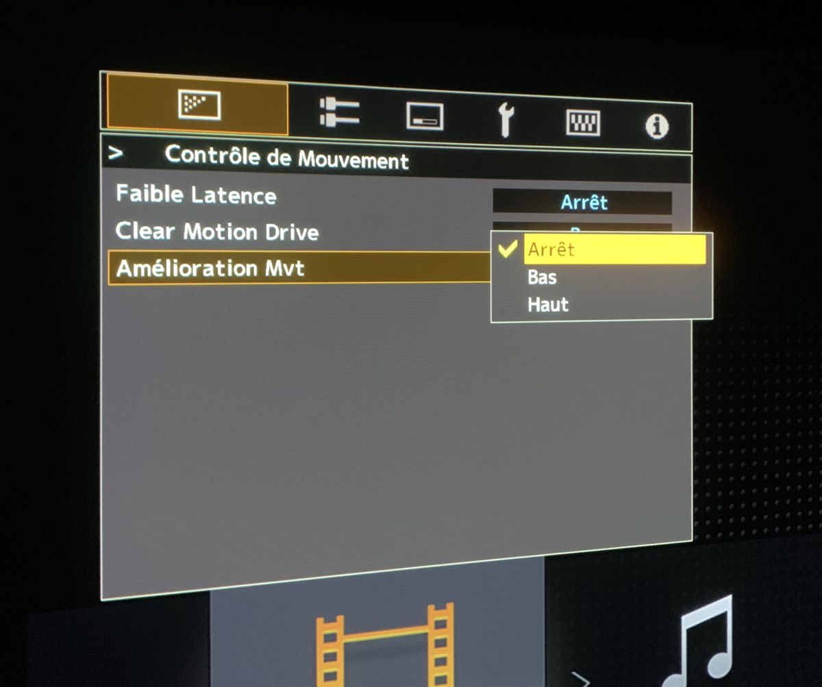 La fonction amélioration Mouvements du JVC DLA-N5 propose trois paramètres, arret, bas et haut.