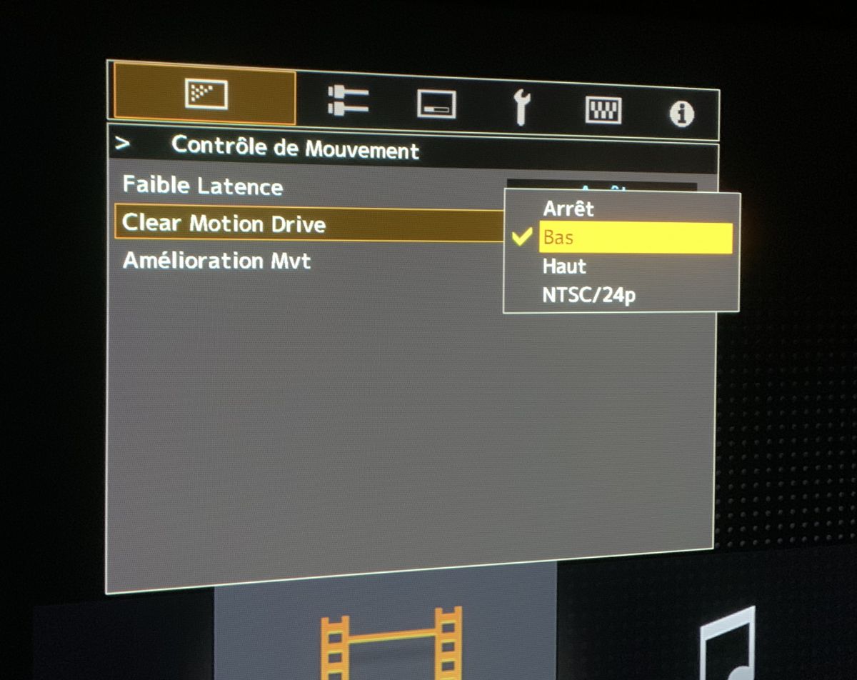Le menu du contrôle de mouvement (CMD) avec le mode faible latence pour les joueurs, CMD bas, haut et NTSC/24P.