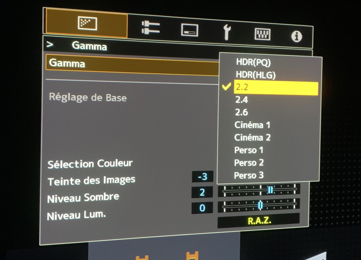 Les pré-réglages gamma sont nombreux, HDR(PQ) et (HLG), les classiques SDR 2.2, 2.4 et 2.6, Cinéma 1 et 2, plus 3 modes Perso.
