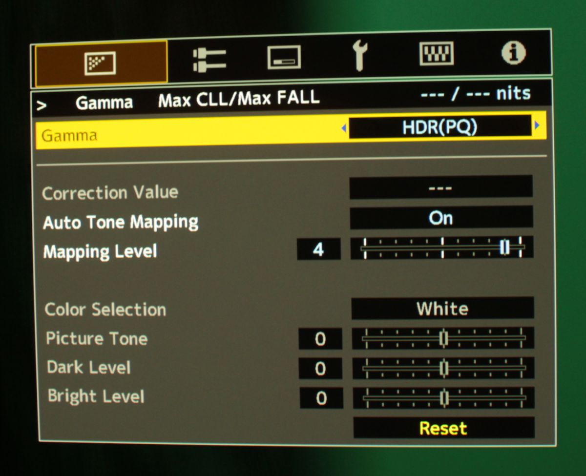 En position "on", un niveau de compression du régulateur manuel de la luminosité de base est accessible. Cela règle principalement la luminosité de l’image "normale" à 50 % du niveau du signal et ne modifie pratiquement pas les hautes lumières. C’est intelligent et vraiment innovant pour un projecteur. Max CLL et Max FALL sont les deux valeurs auxquelles les projecteurs de la série N de JVC s’adaptent automatiquement pour la première fois. Si le niveau de pixel maximum du programme est inférieur au niveau d'affichage maximum, la carte des tons s'ajuste au niveau de pixel pour préserver la luminosité de l'image (éliminant ainsi l'aspect sombre que beaucoup se plaignent de la visualisation HDR). Le terme technique utilisé pour cela est le mappage automatique de tonalité, ceci fournit une image plus lumineuse et de meilleures qualités. Maintenant, vous sentez que le projecteur JVC DLA-N5 interagit avec le contenu HDR et que la projection n’est pas trop sombre. Bien sûr, l’impression n’est pas aussi impressionnante que sur les téléviseurs, mais 110 cd/m 2 (écran de 2 mètres 80 de base microperf), sur un projecteur avec des effets lumineux, c’est plus de 2 fois plus que lorsque vous regardez du contenu SDR !