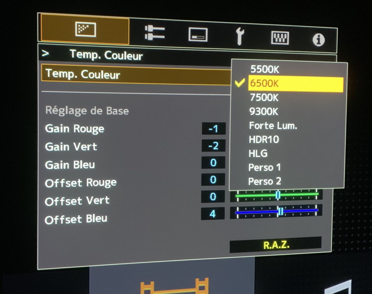 Dans le menu de température de couleur, plusieurs choix sont possibles, 550 K, 6500 K, 7500 K, 9300 K, forte luminosité, HDR10, HLG et deux modes USER.